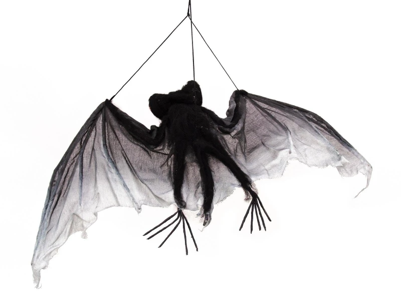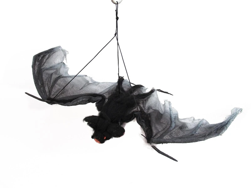 Hangemde zwarte vleermuis, zeer decoratief met rode ogen en rode mond!!
