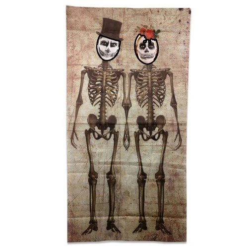 Halloween fotoposter met skeletten. De hoofden op de poster zijn leeg gehouden zodat hier de ideale griezelfoto’s gemaakt kunnen worden. De poster heeft een uitgevouwen maat van 160x75cm. Perfect voor Halloween!
