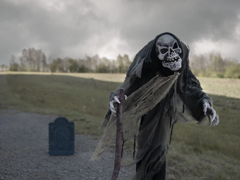 Ben je een Motto- of Halloween feest aan het plannen en zoek je nog een passende decoratie voor de juiste enge sfeer? Met een ondeugende grijns verwelkomt de wandelaar uw gasten. Hij draagt een gescheurd gewaad met capuchon. Zijn holle skeletschedel wordt aan de binnenkant verlicht door twee groene leds. Via een gemotoriseerd mechanisme kantelt zijn hoofd eerst naar voren en dan op en neer alsof hij naar iemand knikt. Een stiekeme lach maakt de animatie compleet. De armen van de figuur kunnen in vorm worden gebogen en zijn benige handen zien eruit als grote klauwen, die hij naar uw gasten uitstrekt. Een stok bestaande uit 3 segmenten kan in zijn linkerhand worden geklemd.